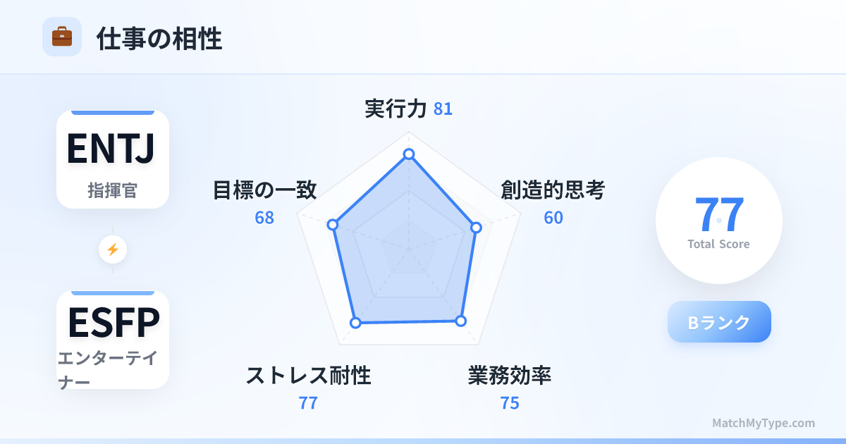 競争と協力が共存します。二人とも目立つことと主導権を握ることが好きです。最善の方法は領域を分けることです。ENTJがバックステージの戦略、ESFPがフロントステージのプレゼンテーションを担当しましょう。公の場でお互いの足を引っ張ることは厳禁です。
