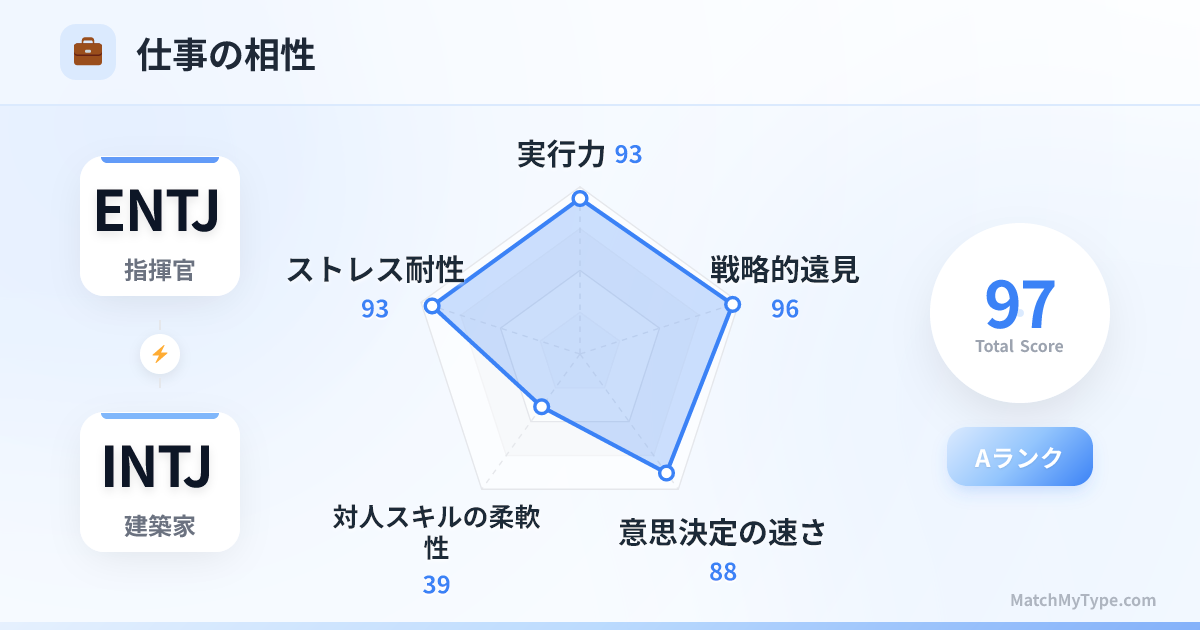 なります。しかし、それは感情的な罵り合いではなく、論理的なディベートです。ENTJとINTJの「強さ」は次元が異なります。ENTJは行動と場のコントロールにおいて強く、INTJは思想と譲れない原則において強いのです。ENTJがINTJの独立した思考空間を尊重し、INTJがENTJの対外的な行動に協力すれば、この補完性は衝突を遥かに上回ります。