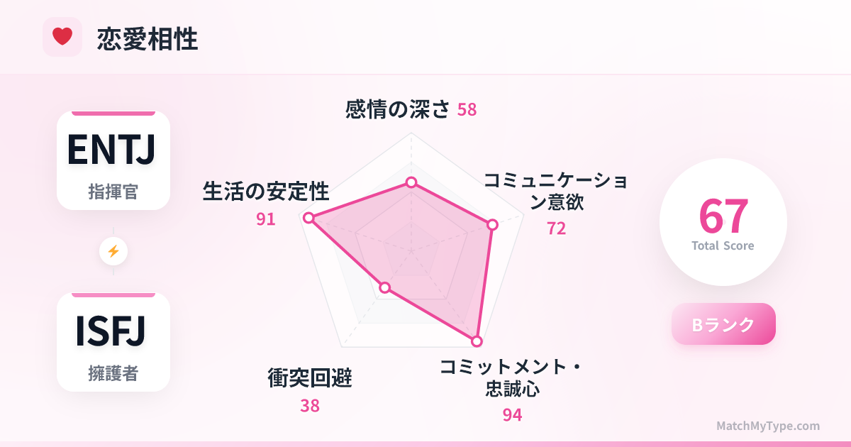 これは詩的でスピリチュアルなロマンスではなく、「需要と供給」に基づいた堅固な同盟です。ENTJは野心を支える安定した基盤を求め、ISFJは安心感を与えてくれる強力なリーダーを求めます。コミュニケーションの大きな溝を乗り越えられれば、これ以上なく強固な現実世界のパートナーとなるでしょう。