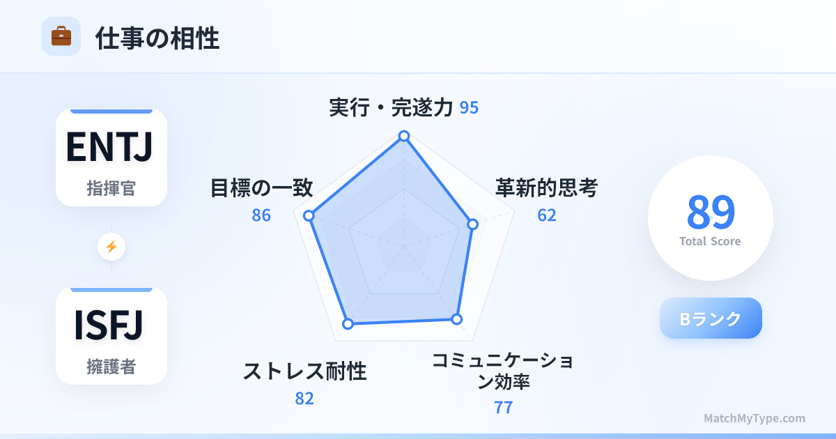 最高の組み合わせです。ENTJが明確な目標と期限を示せば、ISFJは完璧に遂行します。注意点は、賞賛を惜しまないこと。ISFJはポジティブなフィードバックで動くタイプです。「君がいないと回らない」という一言が、ISFJのモチベーションを最大化します。