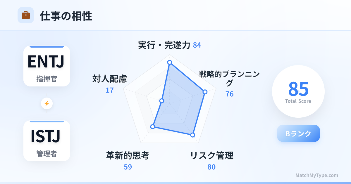 これは職場における「ドリームチーム」です。ENTJは舵を取るCEO、ISTJは堅実なCOO。 「革新」と「保守」の矛盾さえ解決できれば、どんな競合も打ち破り、困難なKPIも達成できるでしょう。