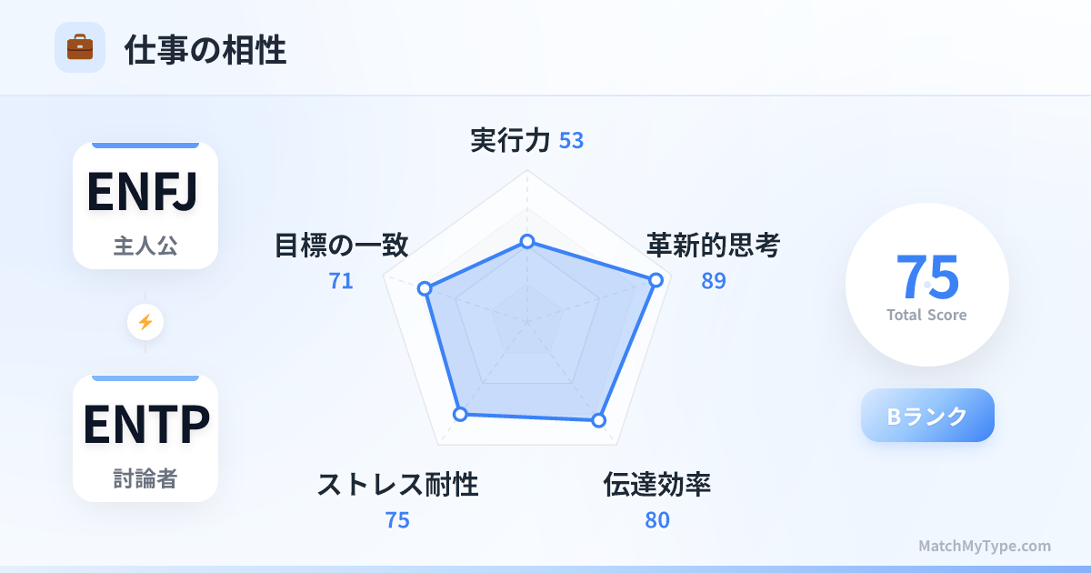 ブレインストーミングの最高の相棒です。会議室では二人の掛け合いが場を盛り上げます。しかし、役割分担は明確にすべきです。ENTPは技術・クリエイティブの攻略、ENFJは対人・プロセスの調整。決してENTPにカスタマーケアをさせたり、ENFJに純粋な論理チェックをさせたりしてはいけません。