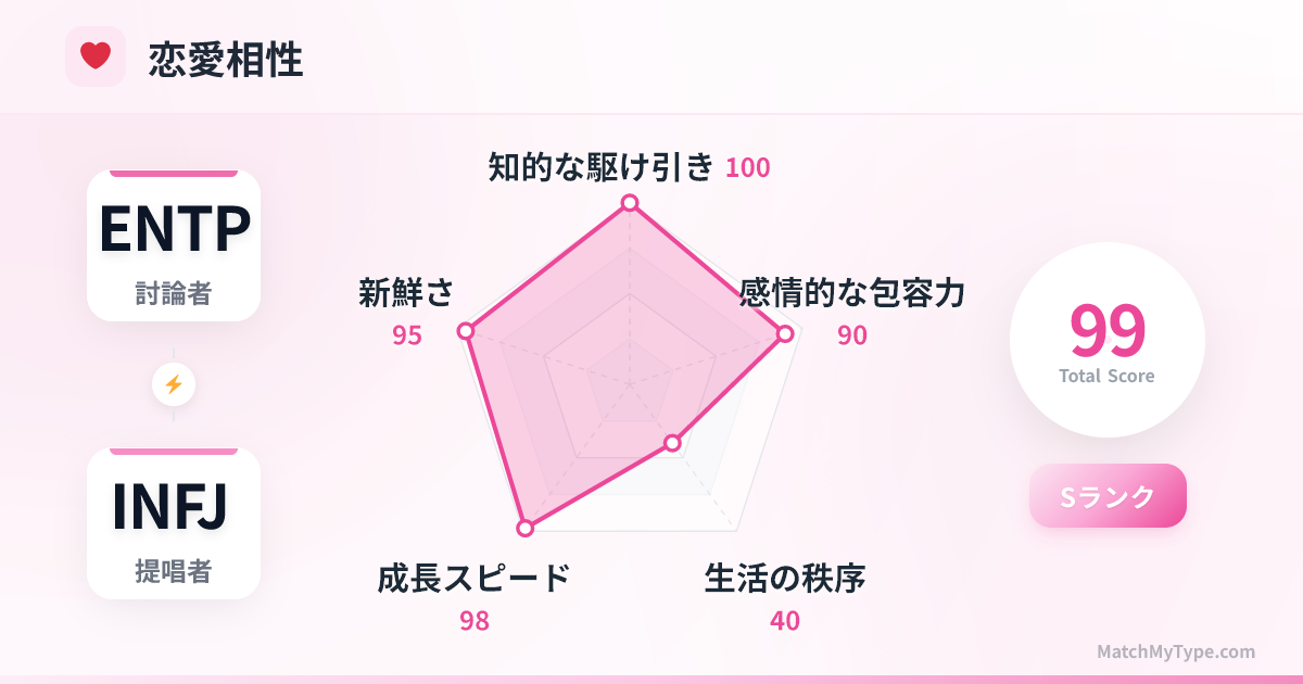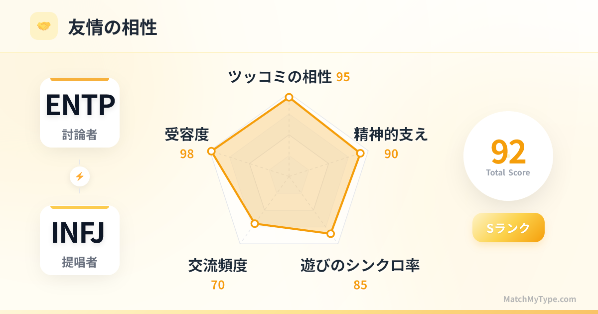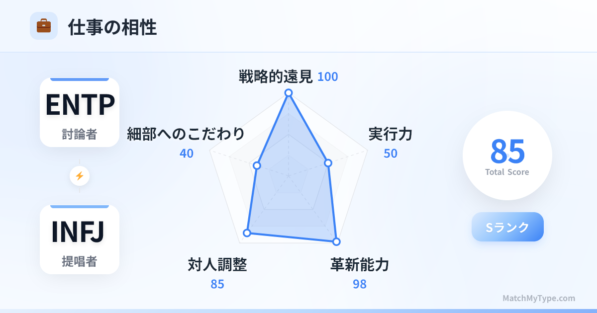 次元の違う革新能力です。ENTPが古いルールを壊して破壊的なアイデアを出し、INFJがそのアイデアに人間味と長期的な意義を与え、潜在的な対人リスクを予測します。ENTPの鋭さとINFJの熟考が合わさることで、競争力と温かみを兼ね備えたプロダクトが生まれます。