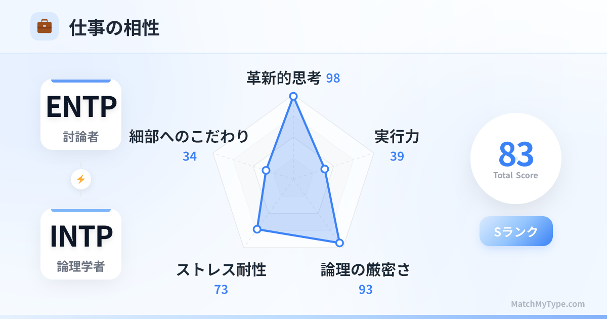 ビジョン提示者と技術オタク。ENTPの上司はINTPに大きな自由度を与えます。これはINTPが最も好む環境です。しかし、ENTPの思考が飛びすぎて、毎日指示が変わるとINTPは「結局どれをやればいいんだ?」と嫌気がさします。ENTPは大方向を決めたら口を出しすぎず、INTPを研究に没頭させるのが得策です。