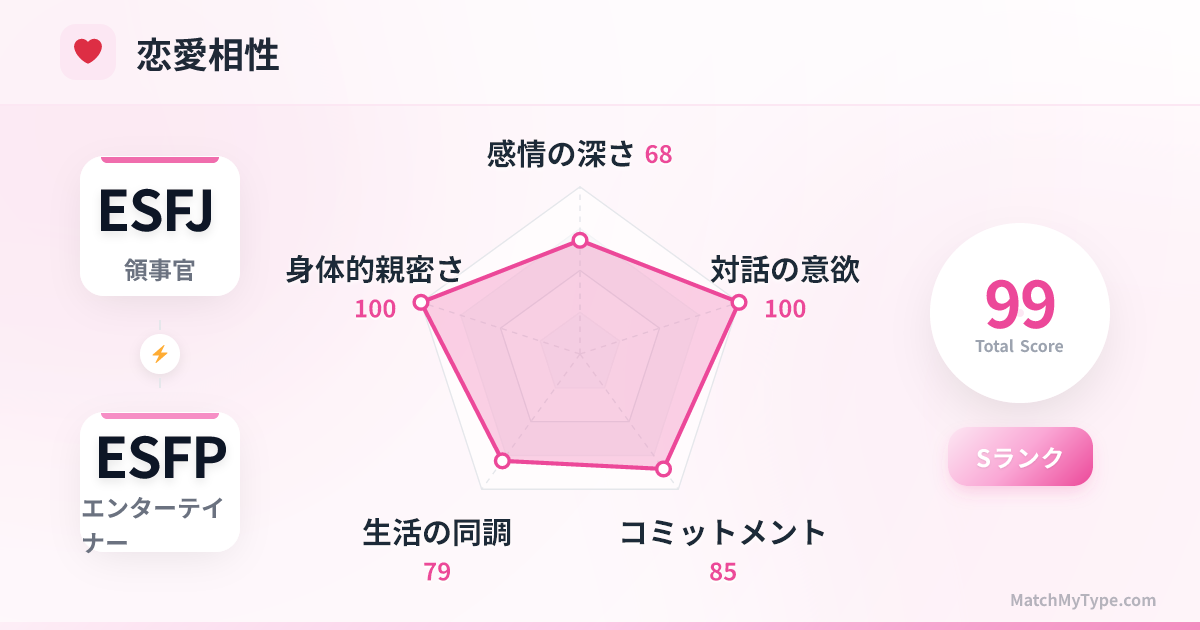 二人とも高い社交エネルギー(E)を持つ「外向的感覚型」です。ESFJが場を仕切り、全員に気を配り、ESFPがその場でスポットライトを浴びて盛り上げる。このホストとゲストの関係は天衣無縫です。