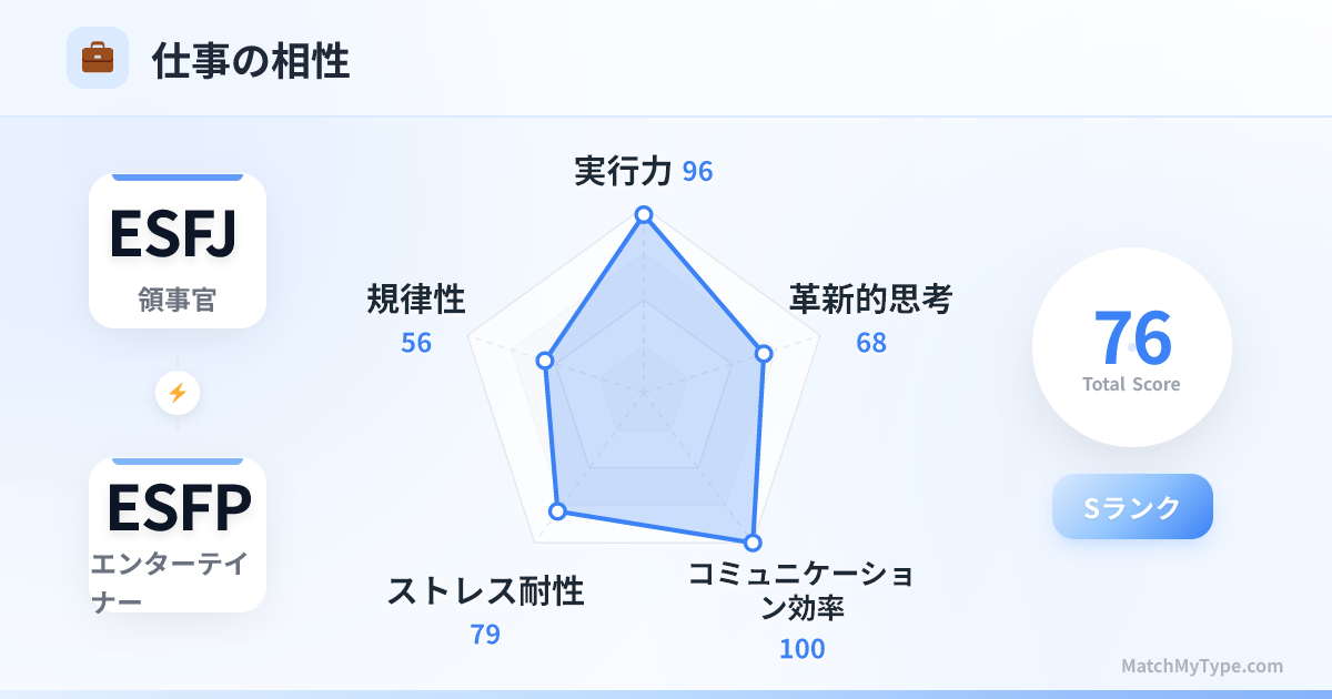 ムードメーカーコンビ。広報、営業、イベント企画、カスタマーサービスなど、高いEQと瞬発力が求められる分野では無敵です。ESFJがプロセスを管理し、ESFPが現場を盛り上げ、魅力的なプレゼンを行います。