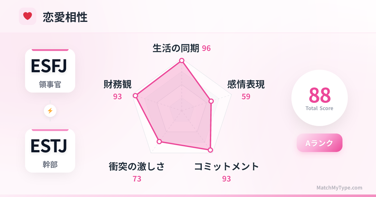 二人ともSJ(守護者)タイプであり、伝統を重んじ、ルールを尊重し、安全を求めるという同じ「OS」を共有しています。ESFJは、ESTJの決断力、能力、責任感に惹かれ、頼りがいのある存在として見ます。一方、ESTJはESFJの情熱、細やかさ、そして高い社会的知性に心を動かされ、家庭を守り一族の評判を維持してくれる完璧な伴侶を見出します。二人とも「サプライズ(通常、あなたたちにとっては驚異)」を嫌い、計画通りに進むことを好むため、関係における摩擦の90%が解消されます。