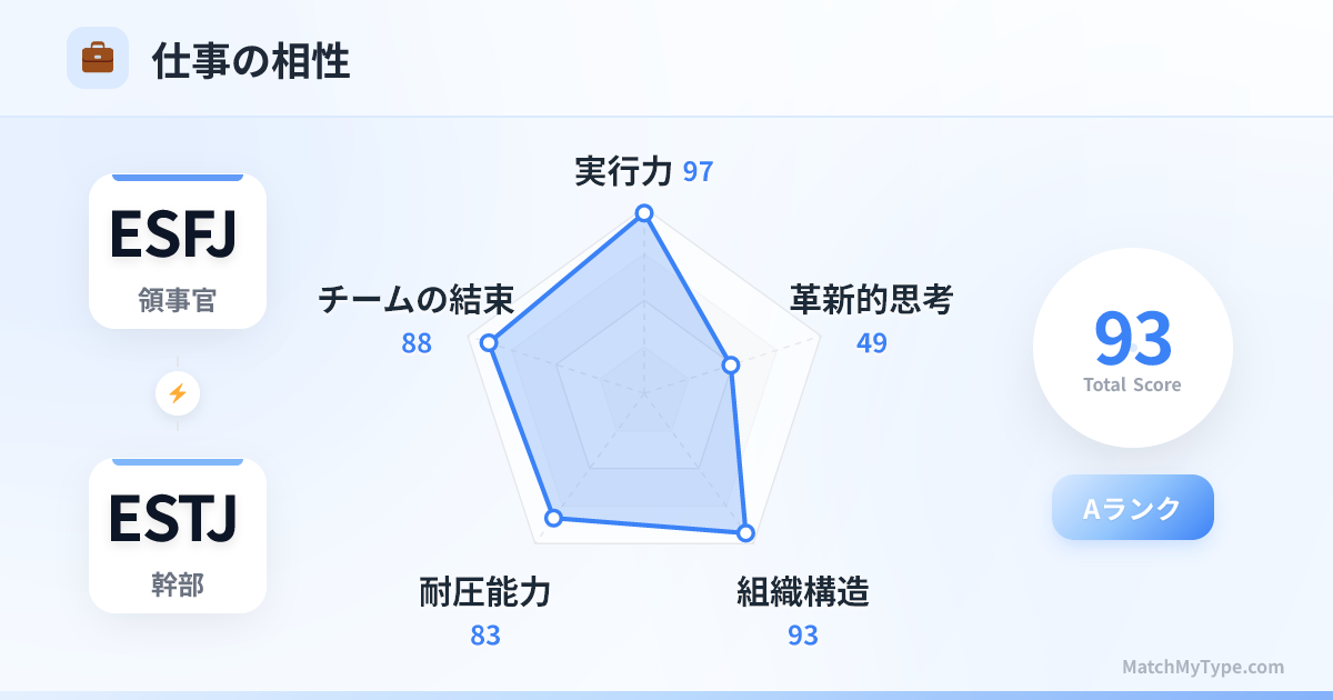 最強のタッグです。一方が「厳しい役」、もう一方が「優しい役」を演じます。プロジェクト推進時、ESTJがプレッシャーと進捗管理を担い、ESFJが潤滑油と後方支援を担います。役割分担を明確にし、「人への接し方」で争わないことが鍵です。