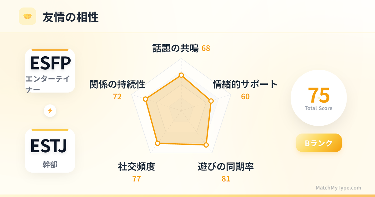 最高の補完関係です。論理が必要な場面ではESTJが、感情的な配慮が必要な場面ではESFPが前に出ます。チームビルディングではESFPが盛り上げ、ESTJが店の手配や送迎を完璧にこなします。お互いの専門領域に干渉せず、役割を明確にすれば、非常にスムーズに進みます。