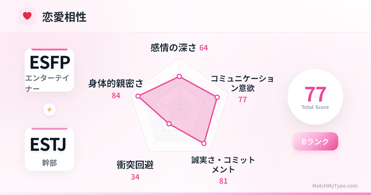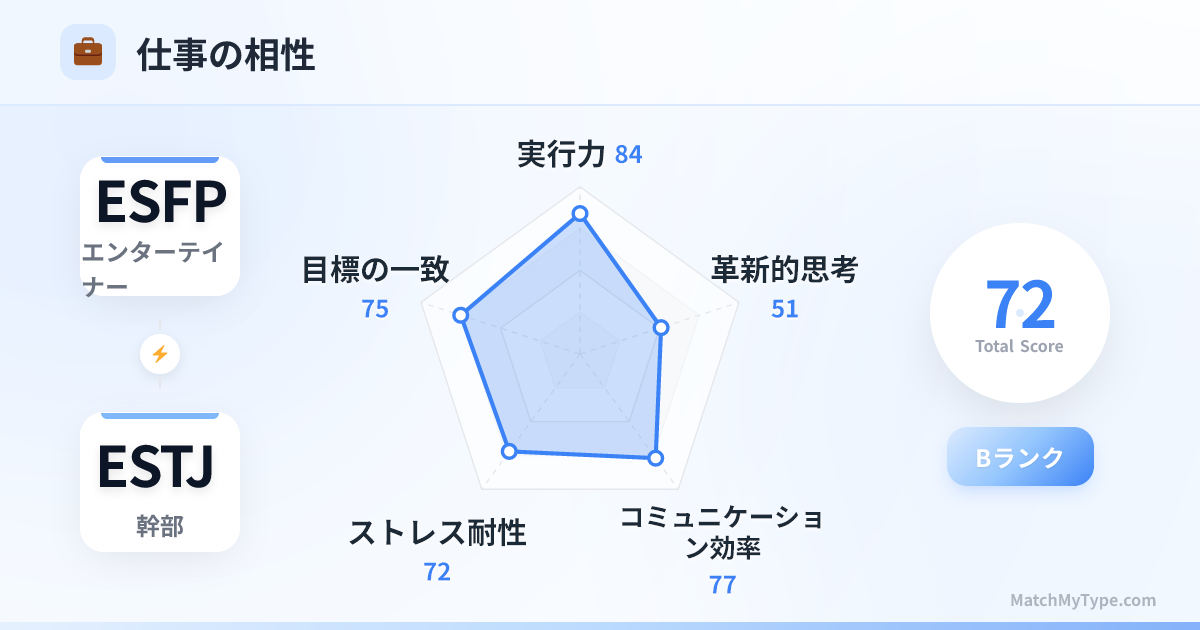 これは「マネージャー」と「スター」の黄金コンビです。ESTJは裏方での計画、プロセス管理、リソースの統合を得意とし、ESFPは表舞台でのプレゼンテーション、顧客とのコミュニケーション、雰囲気作りを得意とします。適材適所に配置すれば、最強の利益を生むチームになります。