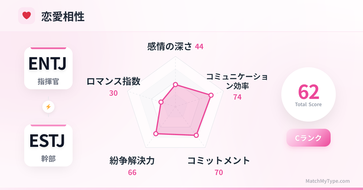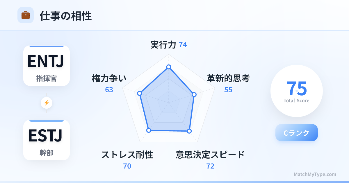 これはMBTI宇宙において最高効率を誇る組み合わせであり、他に類を見ません。ENTJが総司令官なら、ESTJは執行官です。目標が一致すれば、このコンビはあらゆる競合を粉砕し、どんな不可能な任務も完遂します。