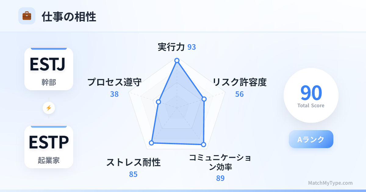 競争と協力が共存します。利益が一致すれば最強の戦友ですが、競合すると激しく衝突します。役割を明確に分けることが重要です。ESTJが内部管理と書類作成、ESTPが外部交渉とプレゼンを担当するのがベストです。