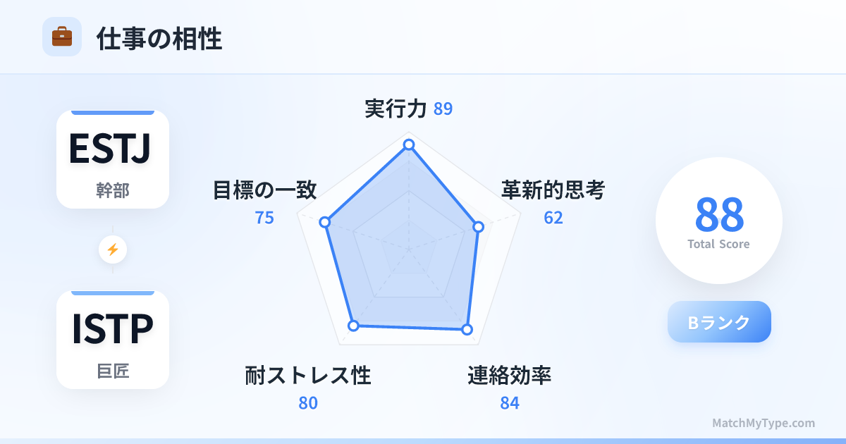 互いの「戦闘力」を高め合える組み合わせです。 **ESTJがISTPから学ぶこと**:混乱の中でも冷静さを保つ方法、ルールに固執せず柔軟に立ち回る方法、そして未来への不安に駆られず「今」を楽しむ方法。 **ISTPがESTJから学ぶこと**:長期的なキャリアプランの立て方、人脈の構築方法、システム化によって個人の能力を最大化する方法、そしてプロフェッショナルとしての自己表現。