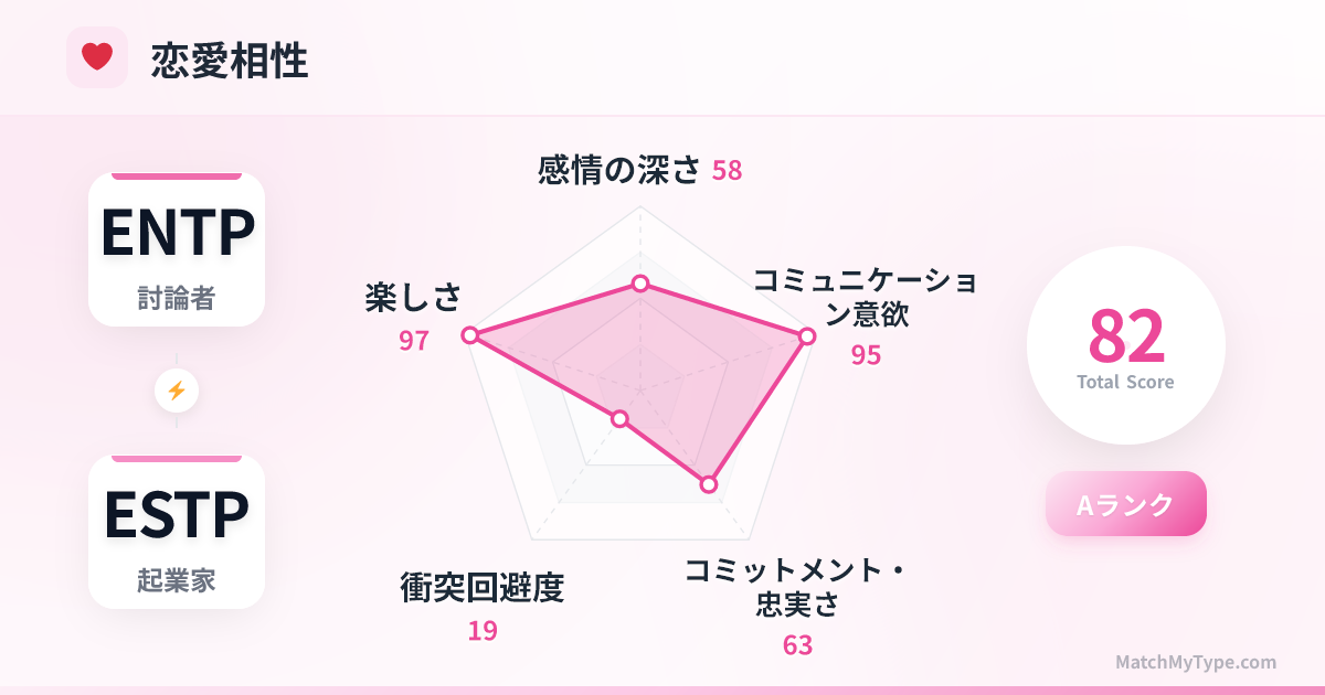 これは「アイデア」と「五感」の究極の衝突です。ENTPはESTPの持つスマートで自信に満ちた「今、この瞬間を生きる」余裕に惹かれ、ESTPはENTPの突拍子もないアイデアを刺激的な現実の体験へと瞬時に変えていきます。一方でESTPは、ENTPの高速回転する頭脳とひねりの効いたユーモアに魅了され、この人は面白いだけでなく常に新しい視点をくれると感じます。二人が一緒にいれば、会話が途切れることはありません。常に「ボケ」と「ツッコミ」の応酬が続きます。