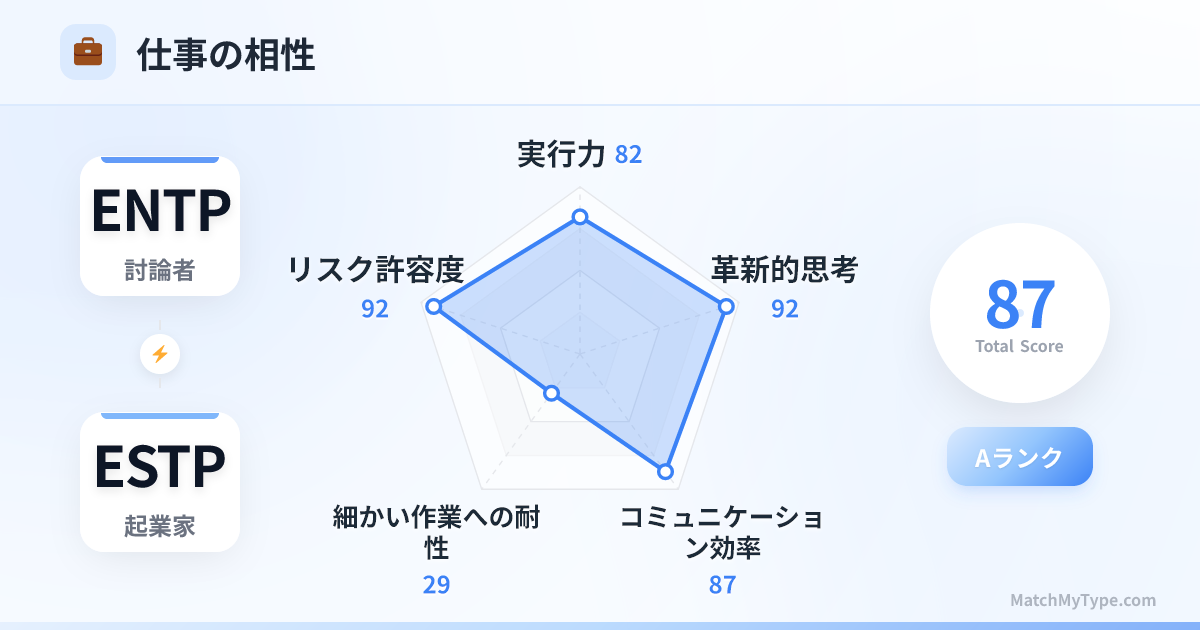 職場において、この二人は「特殊部隊」です。ENTPは戦略参謀、ESTPは前線指揮官。退屈な事務作業さえさせなければ、どんな困難な目標も攻略できるでしょう。