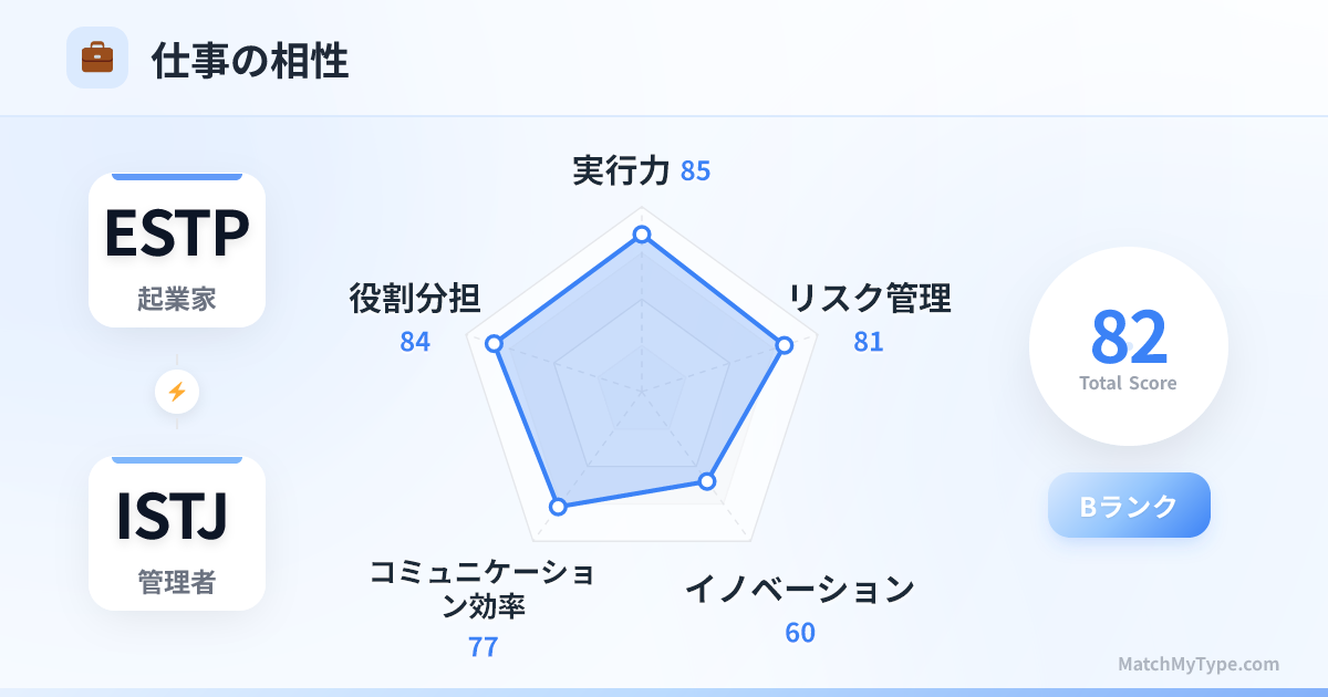 究極の攻守バランスです。ESTPは天性の営業・広報の才能を持ち、新規開拓やトラブル対応に長けています。ISTJは完璧な運営・財務担当で、プロセスの構築やコスト管理、品質の維持を得意とします。ESTPが前線で戦い、ISTJが後方から弾薬を補給する、この連携は無敵です。