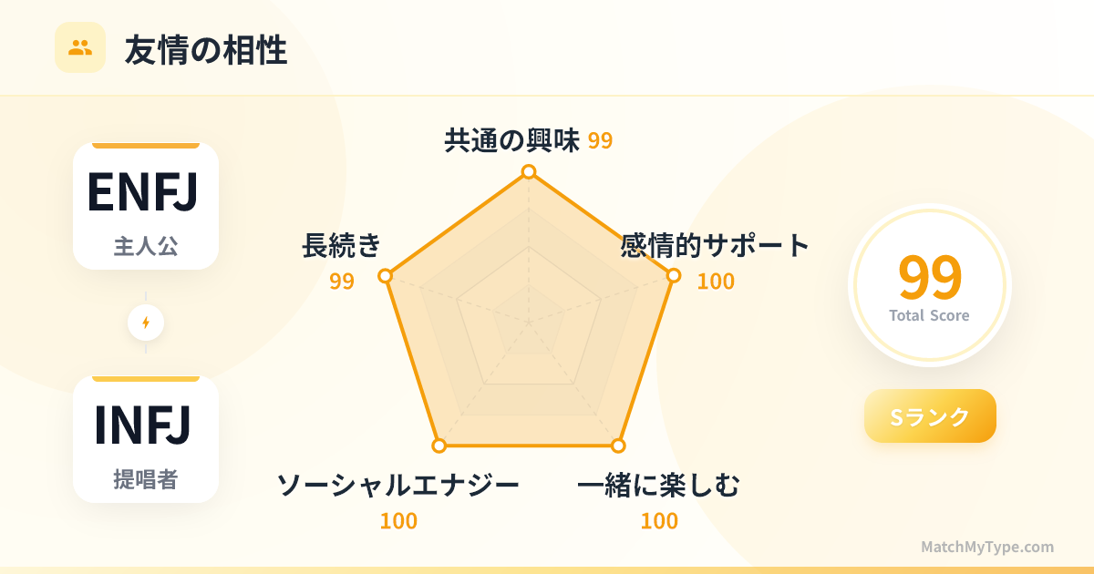 メンテナンスが少なく、それでいて質の高い友情です。3ヶ月連絡を取らなくても、会えば一瞬で空白が埋まり、最近の噂話から宇宙の真理までシームレスに語り合えます。ENFJが場をセットし、INFJが選別する、お互いにとって最高の「社交フィルター」です。