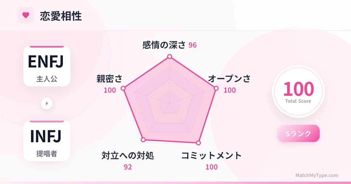 二人は **Ni (内向的直感)** と **Fe (外向的感情)** を共有しており、世界観と価値観が高度に一致しています。 **Feの共振**: 二人とも「感情のスポンジ」であり、相手の微細な表情を瞬時に察知します。メリットは極めて細やかな気遣いですが、デメリットは「相手はこう望んでいるはずだ」という過剰な遠慮のループに陥ったり、二人で負の感情の泥沼に沈んでしまったりすることです。 **Niの補完**: INFJはNiが主機能で、物事をより深く抽象的に捉えます。ENFJはNiが補助機能で、ビジョンを現実の人間関係に結びつけるのが得意です。ENFJはINFJの洞察力に驚嘆し、INFJはそれを行動に移すENFJの能力に感謝します。