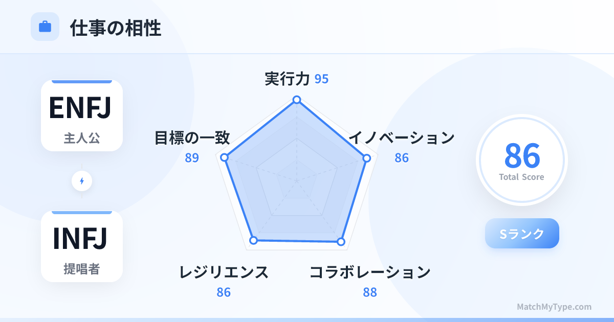 1+1が2以上になるビジョン実現力。INFJが舞台裏で深い戦略と洞察(Ni)を練り、ENFJが表舞台でそれを分かりやすく情熱的な言葉(Fe)で大衆に伝えます。教育、カウンセリング、人事、広報、NPO分野では黄金のペアです。
