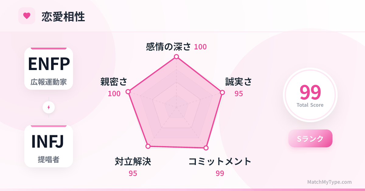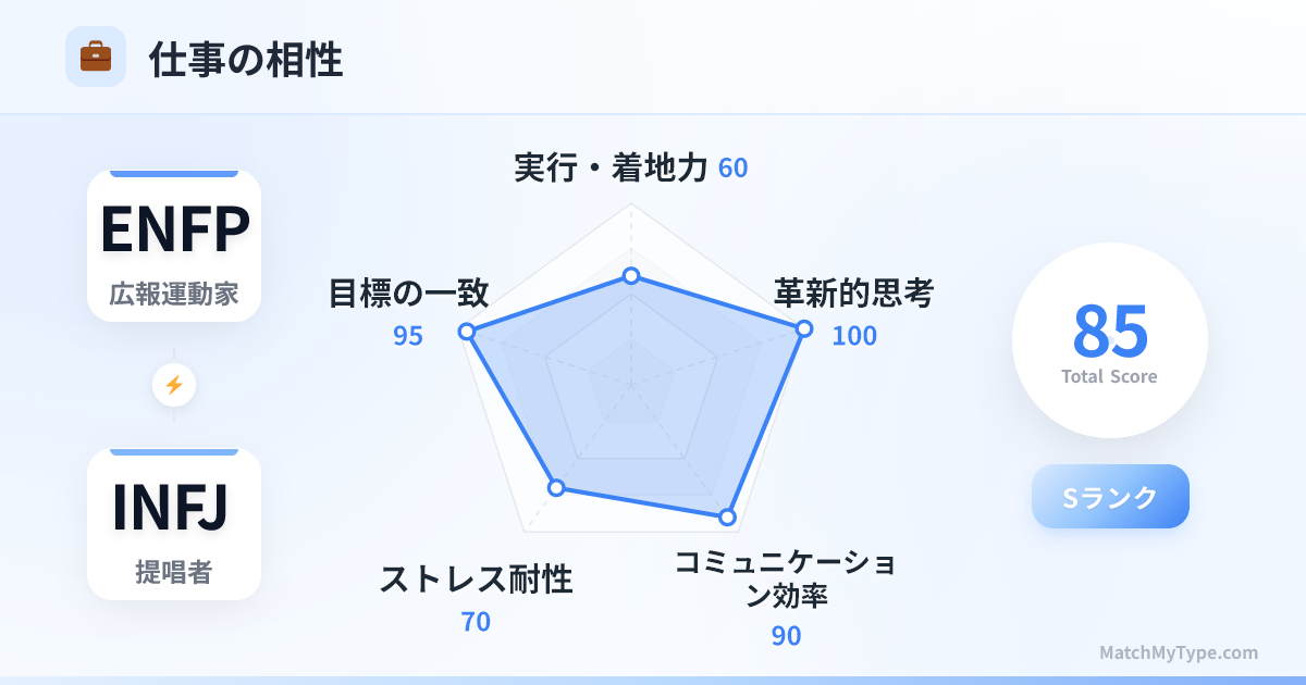 互いを高め合える職場パートナーです。 **ENFPがINFJから学ぶこと**:深く考える方法、現象の裏にある本質を見抜く方法、そして長期的な目標を簡単に諦めずに継続する方法。 **INFJがENFPから学ぶこと**:より自信を持って自分を表現する方法、臨機応変に対応する方法、そして仕事の中に楽しみとリラックスを見出す方法。