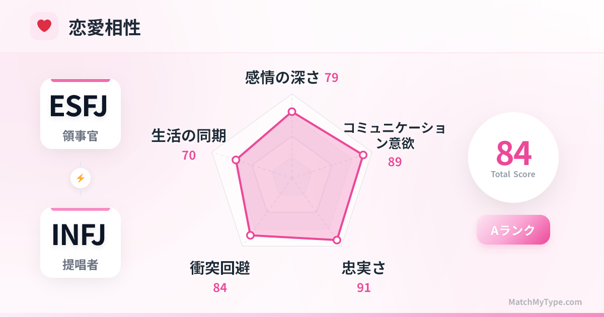 「コミュニケーションのズレ」に注意してください。ESFJは事実(何が起きたか)を話し、INFJは認識(それが何を意味するか)を話しています。チャンネルを合わせなければ、互いに「分かってもらえない」と感じるでしょう。