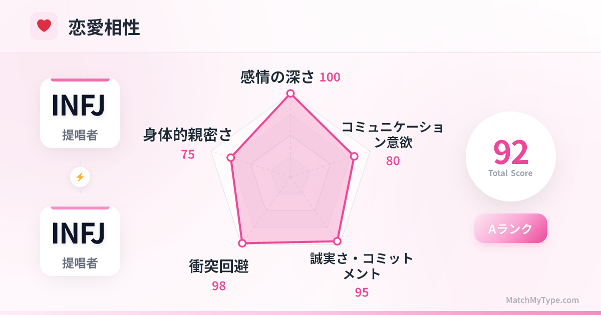 これは「仮面を脱ぎ捨てる」狂宴です。INFJは一生をかけて周囲の環境に自分を合わせ(Fe)、完璧な友人、従業員、あるいはパートナーを演じますが、その内面は極度の孤独に苛まれています。しかし、もう一人のINFJに出会った時、その偽装は通用しません。相手があなたの隠し事を一瞬で見抜いてしまうからです。この「ありのままを見られる」感覚は、恐ろしくもあり、同時に極上の癒やしでもあります。互いの高い感受性と道徳的な一線を瞬時に識別し、宿命的な帰属感を感じるのです。