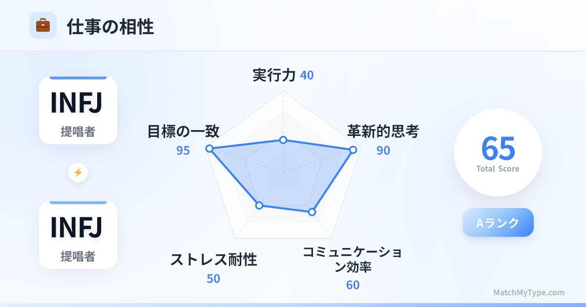 職場において、ダブルINFJコンビは典型的な「夢想家工場」です。完璧なビジョン、崇高な価値観、深い洞察力を持っていますが、それらを現実にするための泥臭い実行力が欠けがちです。進捗を管理する人がいなければ、プロジェクトは永遠に「完璧な構想」段階に留まるかもしれません。