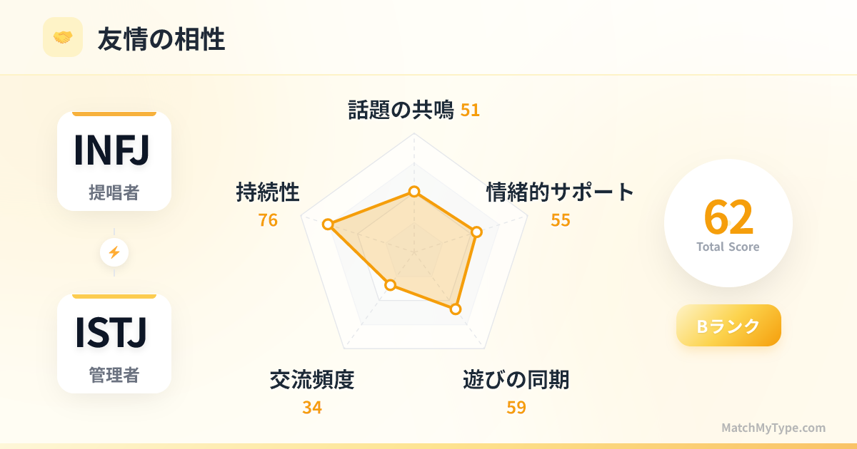 互いの弱点を補い合える組み合わせです。 **INFJがISTJから学ぶこと**:境界線の引き方、不合理な要求への断り方、物理的な環境(部屋の片付けや書類整理)を整えることで心の平穏を得る方法、そして現実から逃げずに立ち向かう姿勢。 **ISTJがINFJから学ぶこと**:他人の言葉の裏にある意図を理解する方法、仕事に人間味のある配慮を注入する方法、目先の困難を超えて長期的な戦略を考える視点、そして「不完全さ」や「不確実性」を受け入れる寛容さ。