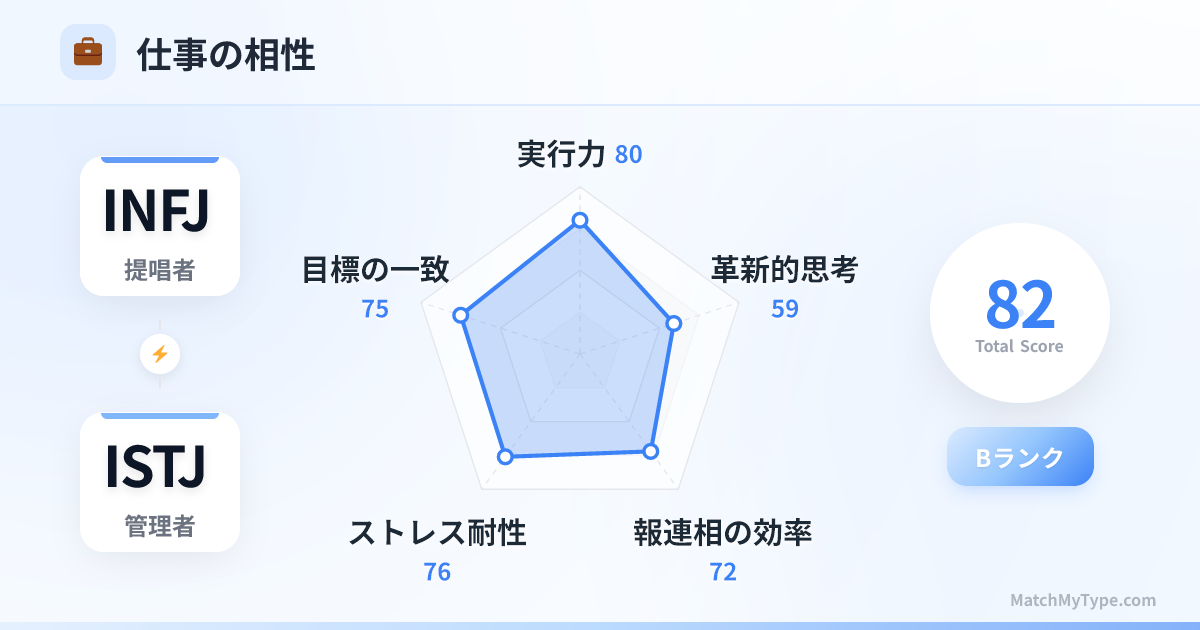 職場における「ドリームチーム」です。INFJが方向を示し、ISTJが確実にそこへ到達させます。一人が「正しいことをする(戦略)」を担当し、もう一人が「正しく実行する(遂行)」を担当します。コミュニケーションさえ円滑なら、不可能なプロジェクトはありません。