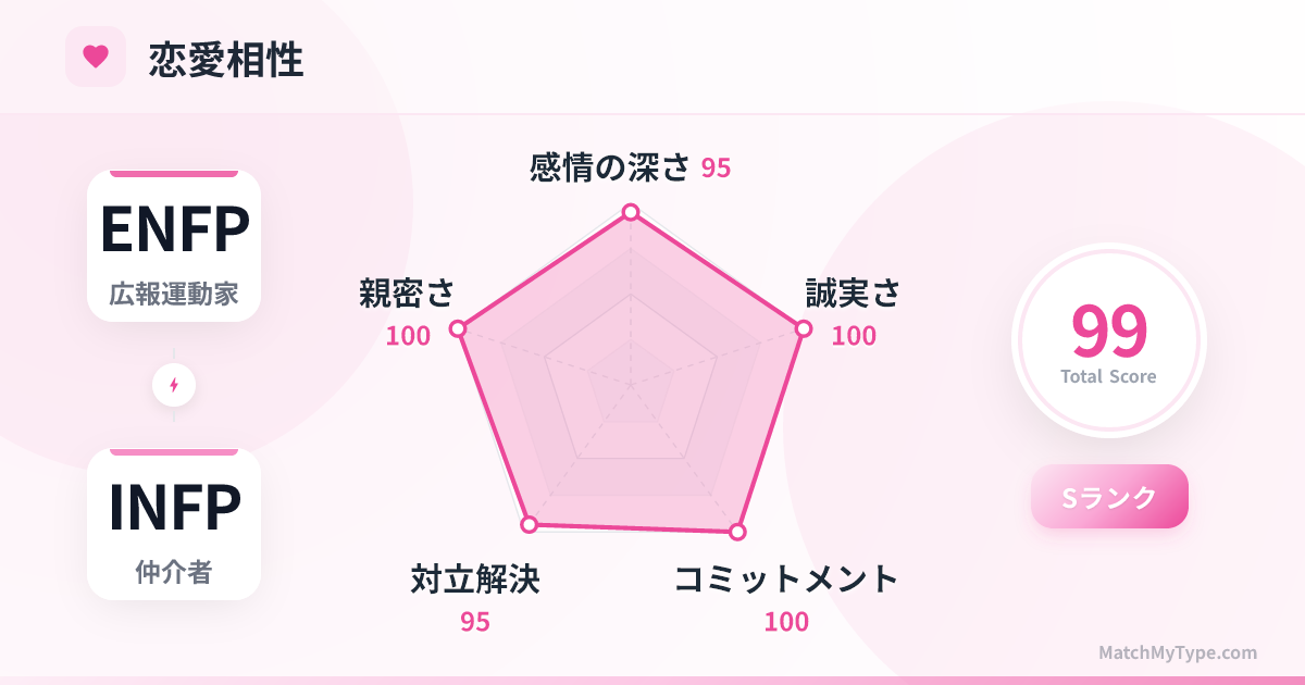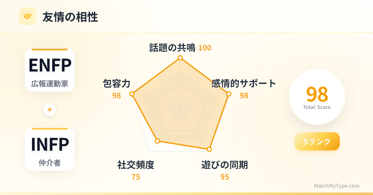 互いにインスピレーションを与え合えるペアです。 **ENFPがINFPから学ぶこと**:喧騒から離れて心を落ち着かせ、外からの刺激を求めるのではなく、内面の感情を深く掘り下げる方法。一つの作品をじっくりと磨き上げる集中力。 **INFPがENFPから学ぶこと**:批判を恐れずに自分を表現する方法。内面の考えを説得力のある言葉に変えて他者に影響を与える方法。より積極的に世界と関わる姿勢。