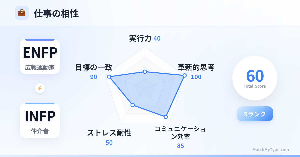 「サボり仲間」になりやすい関係。隣に座ると、お喋りの誘惑が強すぎて効率が激減します。ENFPが外部連絡やプレゼンを担当し、INFPがコンテンツ制作やデザインを担当するのがベストです。進捗管理のために必ず「第三者」やツールを介在させてください。
