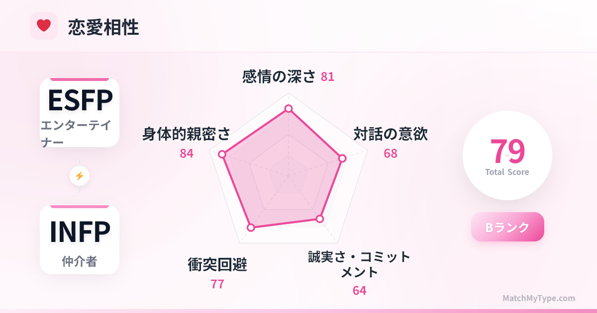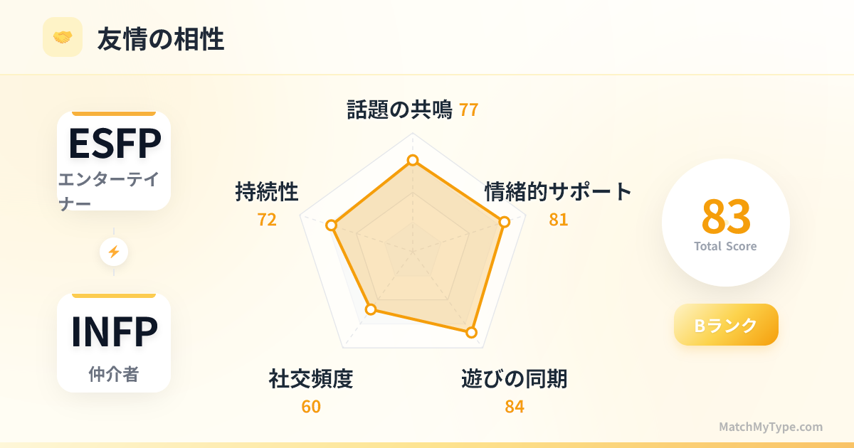 お互いの「楽しみの源」であり「感情のゴミ箱」です。ESFPがINFPを部屋から連れ出して日光浴をさせ、INFPはESFPが傷ついた時に最も温かい抱擁を提供します。MBTIの中でも、最高に遊び尽くし、かつ心で語り合える組み合わせの一つです。