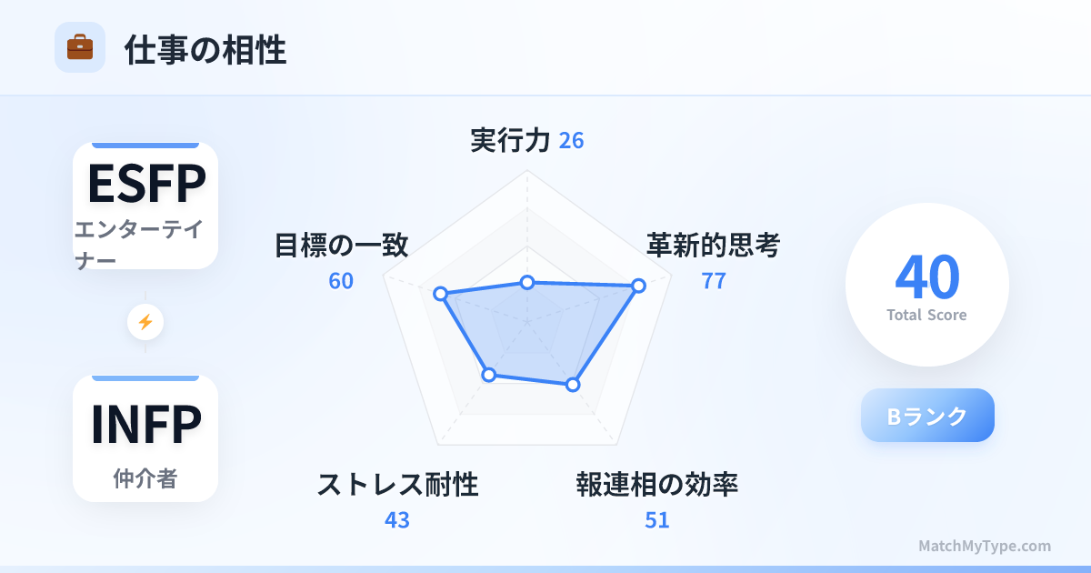 二人とも大量のポジティブフィードバックを必要とします。ESFPには「仕事ができる」「魅力的だ」、INFPには「良いアイデアだ」「独特だ」と褒めることが、効率を上げる燃料になります。