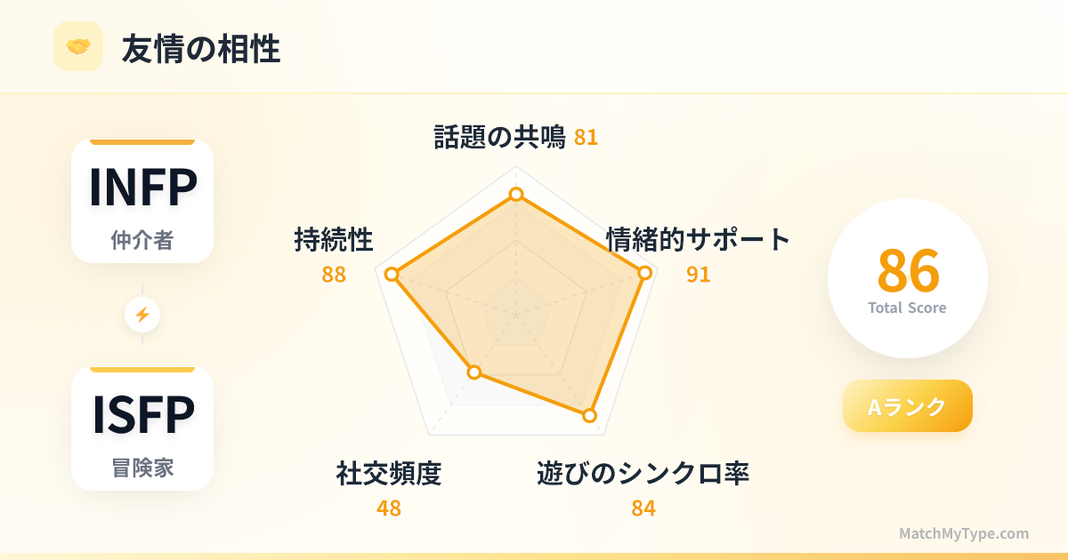 お互いをバランスの取れた地点へと引き寄せ合える組み合わせです。 **INFPがISFPから学ぶこと**:空想から現実へ着地し、日々の生活(衣食住)に目を向ける方法。空想ではなく行動によって不安を解消する方法。ファッションや生活美学の磨き方。 **ISFPがINFPから学ぶこと**:現象の背後にある本質を見抜く方法。複雑な内面の感情を言葉で表現する方法。より長期的な視点と想像力を持つこと。