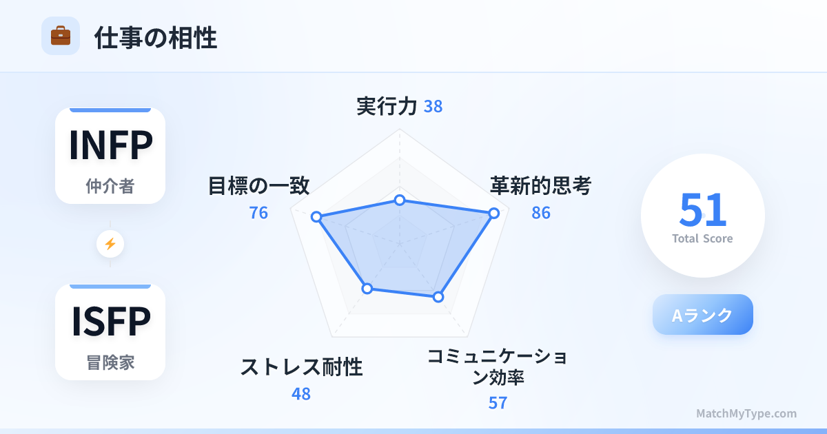 美意識と価値観の高度な一致。利益のために魂を売ることを嫌い、仕事の意義や美しさを追求します。INFPがクリエイティブなコンセプトやストーリーを提供し、ISFPがビジュアル表現や感覚的な体験を形にします。出来上がるプロダクトは、非常に芸術的で人間味に溢れたものになるでしょう。