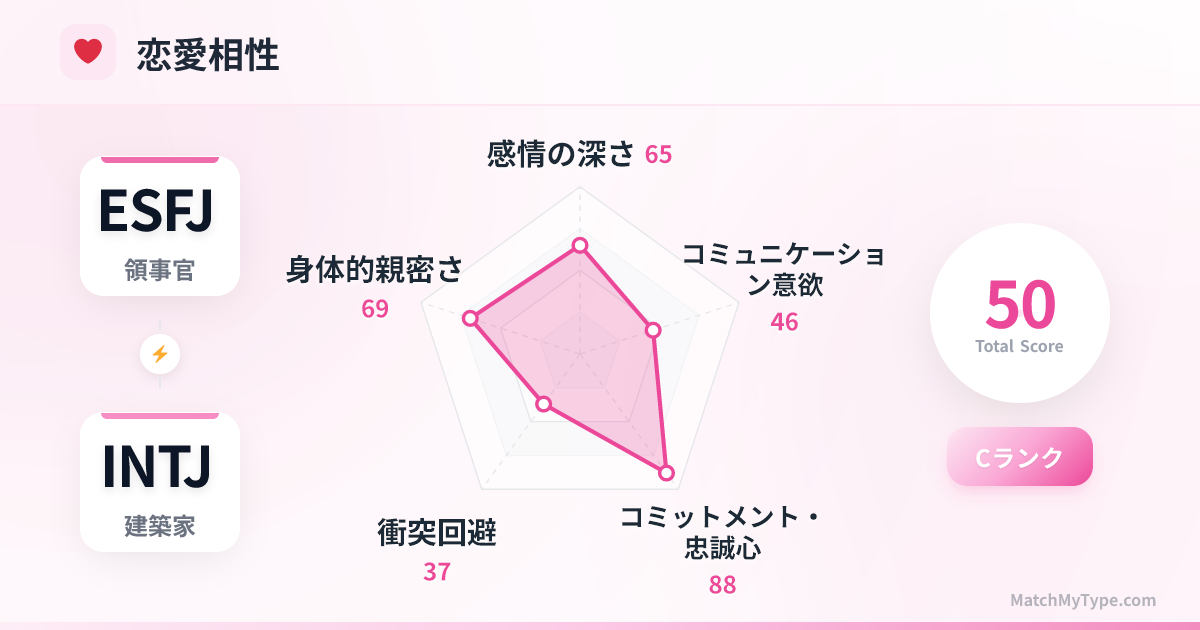 これは「宇宙人同士の対話」レベルの組み合わせです。ESFJは今ここにある人間関係の中に生き、INTJは未来の抽象的な論理の中に生きています。共通の認知機能が一つもないため、視線一つ、言葉一つをとっても、相手に正しく理解されるためには「翻訳」が必要です。ここでの愛は単なる感情ではなく、意識的なトレーニングを必要とするスキルなのです。