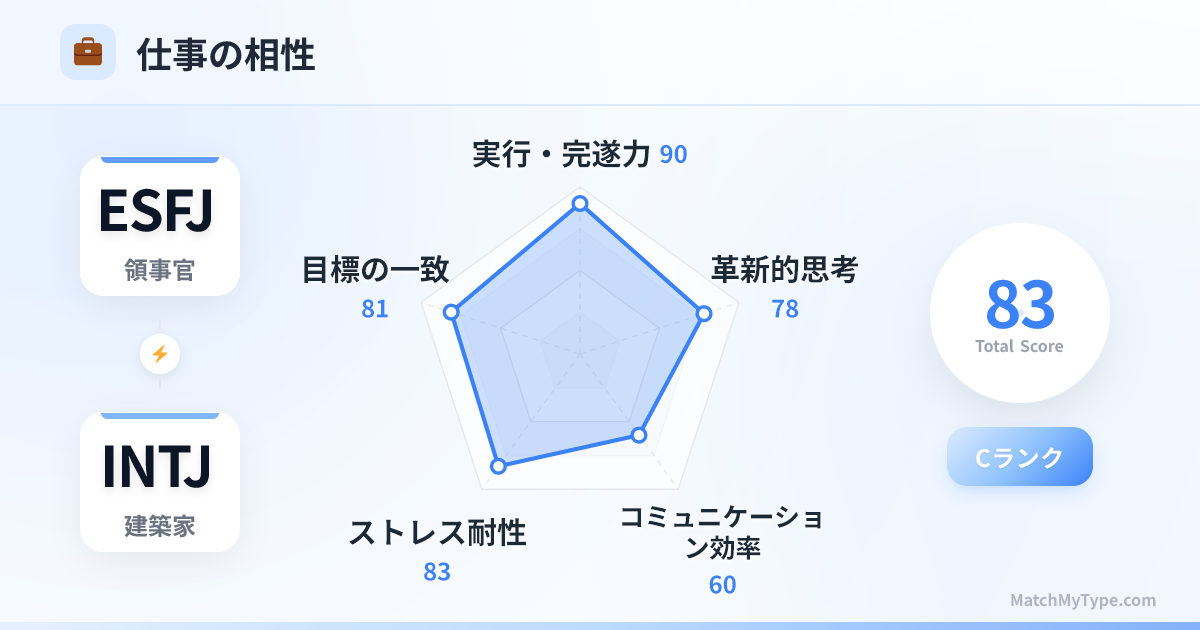 恋愛に比べ、職場での二人は「最強のタッグ」です。ESFJは完璧な実行者でありチームの潤滑油、INTJは完璧な戦略家でありシステムアーキテクトです。互いの専門領域に干渉しない限り、難攻不落のビジネス帝国を築けるでしょう。