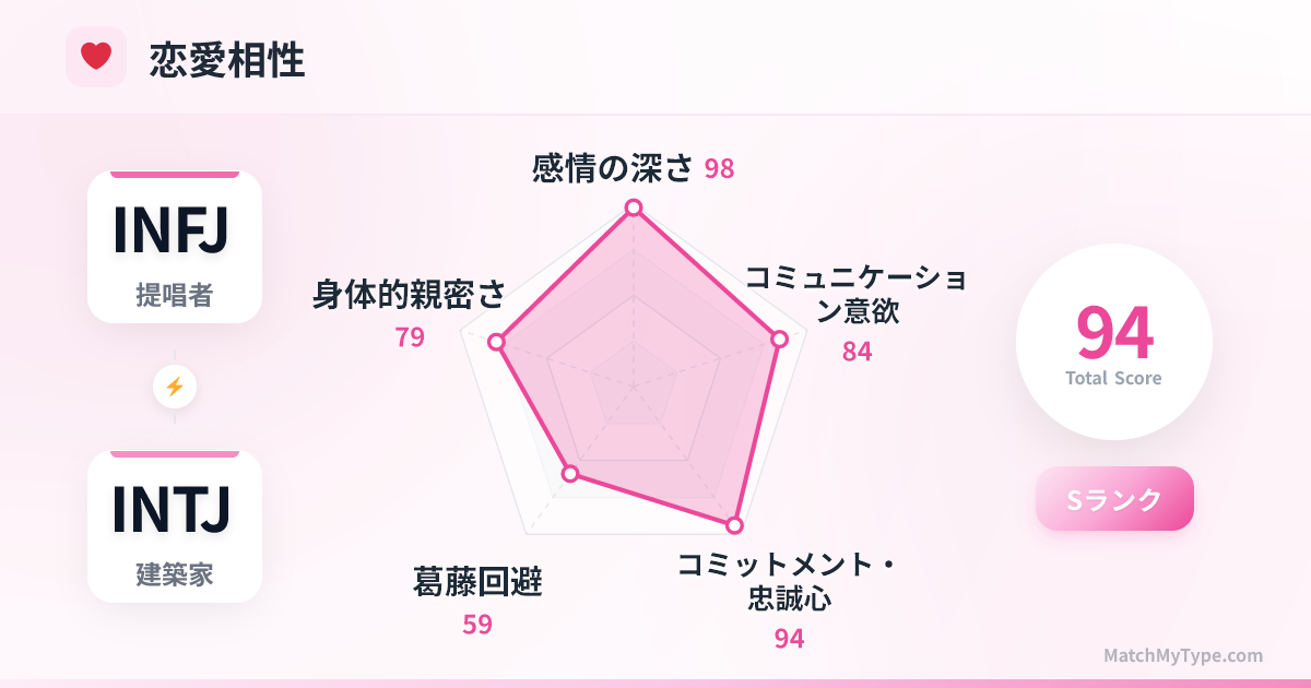 これは高度な「脳内的な魅力」です。INTJは、人の心を見抜きながらも優しさを失わないINFJの洞察力と、冷徹な理論を温かい力に変える力に魅了されます。一方、INFJはINTJの絶対的な理知、決して周囲に流されない独立した思考、そして強力な実行力を崇拝します。INFJはINTJに隠れた感情(Fi)を解放する安全な港を与え、INTJはINFJに無駄な葛藤(Fe)を断ち切る鋭い剣を与えます。