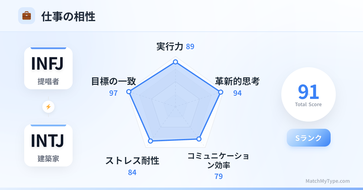 これはMBTIの中で最強の「ビジョン+実行」コンビの一つです。INFJが壮大なビジョンを描き人心を掌握し、INTJがシステムを構築し強力に実行します。目標が一致すれば、どんな障害も打ち砕くことができます。