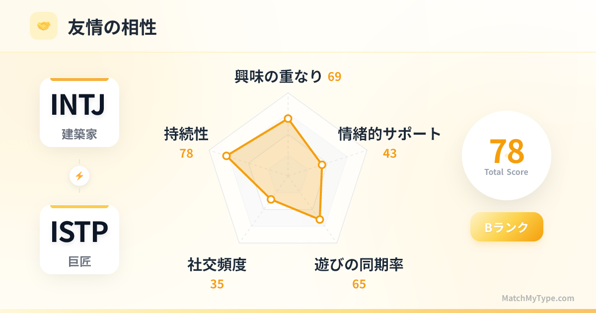 二人とも内向型(I)であり、騒がしく無意味な社交の場を嫌います。パーティーの隅で他の人々の非論理的な行動にツッコミを入れているようなコンビです。一緒にいる時、沈黙は金であり、誰も気まずさを感じません。無理に話題を探す必要はなく、「隣に座ってそれぞれ自分のスマホをいじっている」状態が、彼らにとっての質の高い社交です。