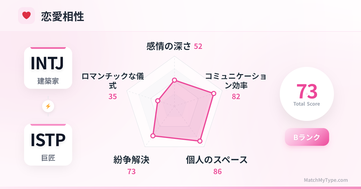 これは花束やキャンドルディナー、甘い言葉に溢れたラブストーリーではありません。INTJとISTPの結合は、むしろハードSF映画のようです。互いの知性への敬意と独立した人格への尊重に満ちています。ドラマチックな感情表現を好まない二人の関係は非常に爽やかで安定していますが、冷静すぎて温かみに欠けると感じることもあるでしょう。
