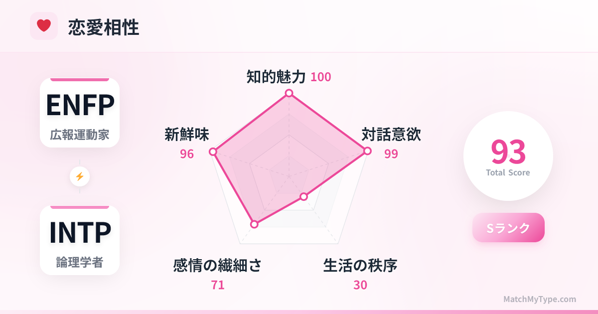 生き別れた双子を見つけたような感覚です。ENFPが情熱を注ぎ込み、INTPが珍しく心を開いて受け入れます。一晩中語り合い、相手を世界で最も面白い人間だと確信します。