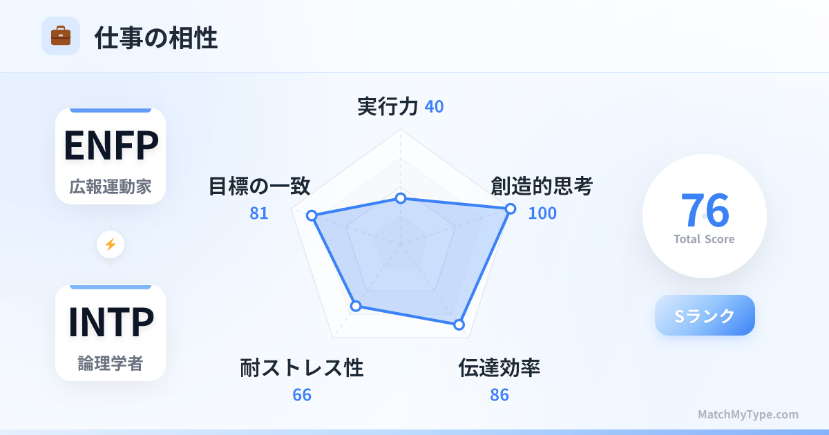 イノベーションに限界がありません。ENFPは拡散的で分野を超えた発想が得意で、INTPは深い分析と論理構築が得意です。0から1を生み出すクリエイティブ産業(広告、ゲームデザイン、研究など)では無敵です。また、ENFPは社交下手なINTPに代わってクライアント対応やプレゼンをこなしてくれます。