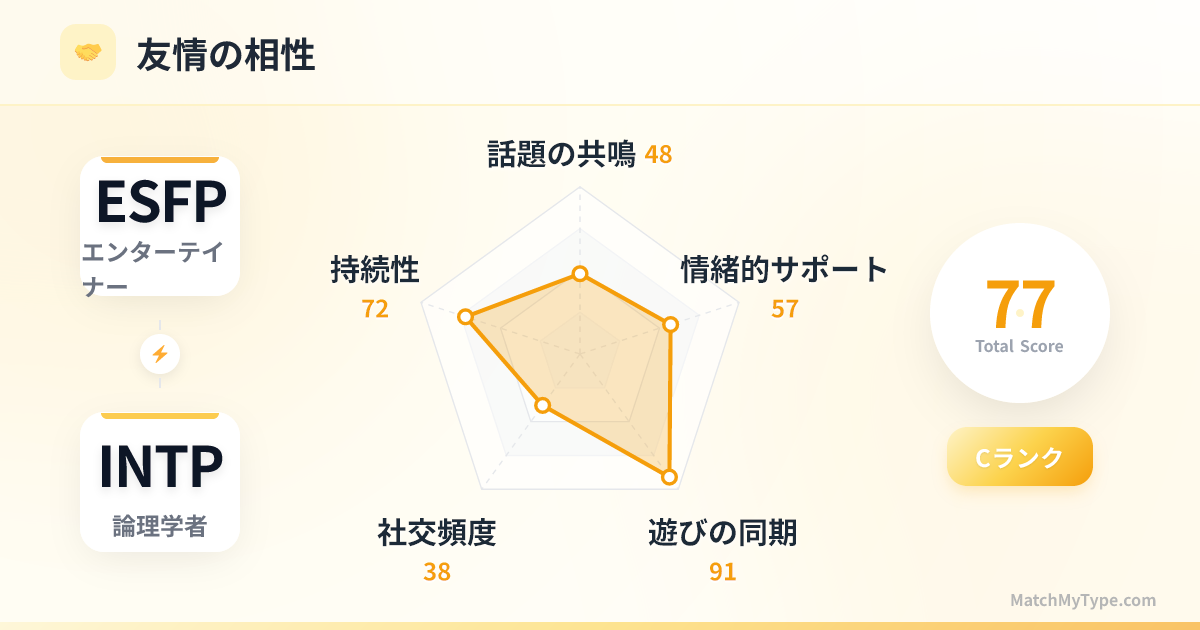 全く対等ではありません。ESFPは発電所、INTPは蓄電池です。ESFPは社交で充電しますが、INTPは1時間の社交で1日の充電を必要とします。友人として、ESFPはINTPの「突然の失踪」を絶交ではなく「電池切れ」だと理解する必要があります。ベストなのは、ESFPが場をセッティングし、INTPは前半だけ参加して、満足したら早めに帰ることを許容するスタイルです。
