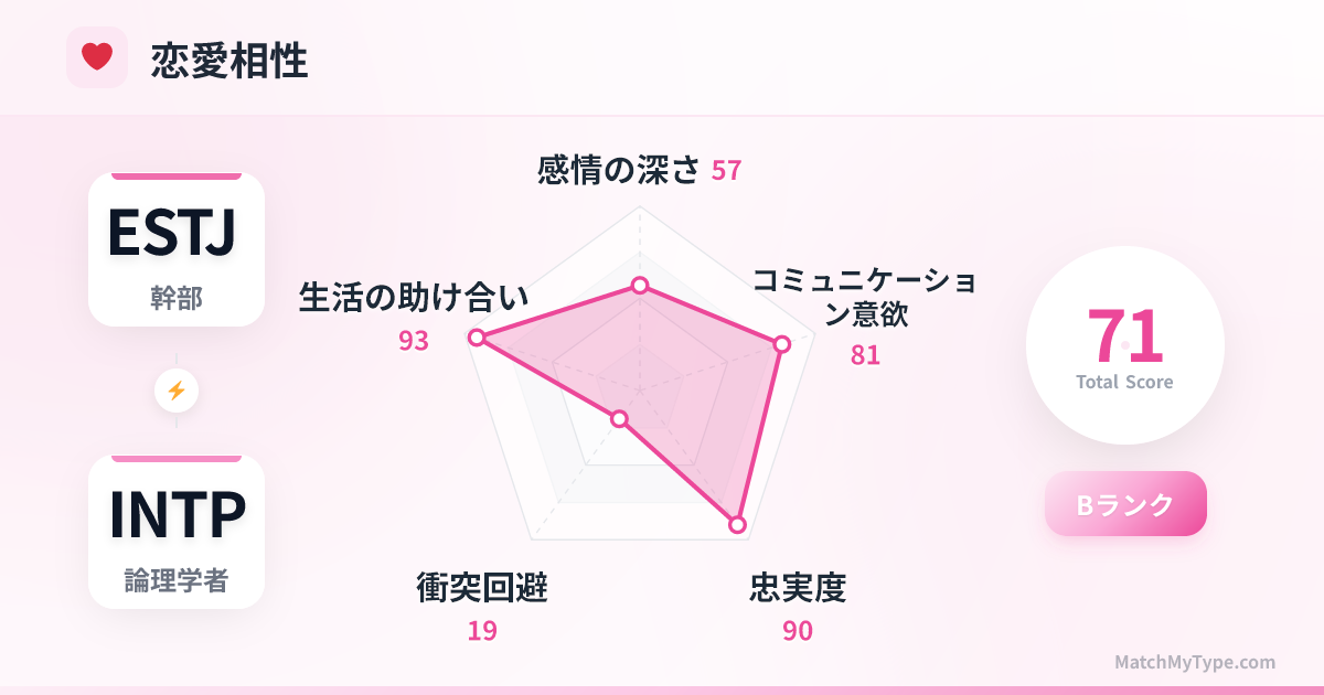 戦略と実行の完璧なクローズドループです。INTPはシステムの欠陥発見、革新的な案の提示、長期計画(Ti + Ne)を得意としますが、細部の実行や調整を嫌います。ESTJはプロセスの策定、スケジュールの管理、リソースの配分(Te + Si)に長けています。INTPが指し示した方向にESTJが突き進む時、効率は最大化されます。