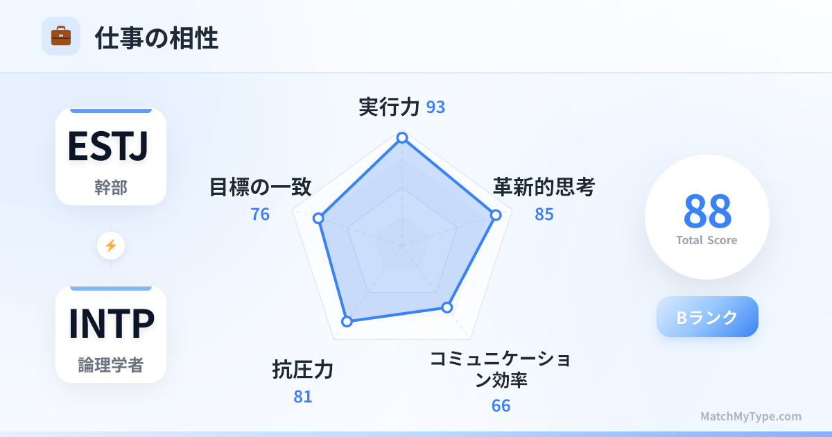 プレッシャーの強い組み合わせです。ESTJの上司は勤怠、日報、進捗を細かくチェックしますが、これはINTPにとって悪夢です。INTPは「成果主義」の評価を勝ち取り、質の高いアウトプットと引き換えに自由を確保すべきです。ESTJはINTPの作業プロセスに干渉しすぎないことが肝要です。