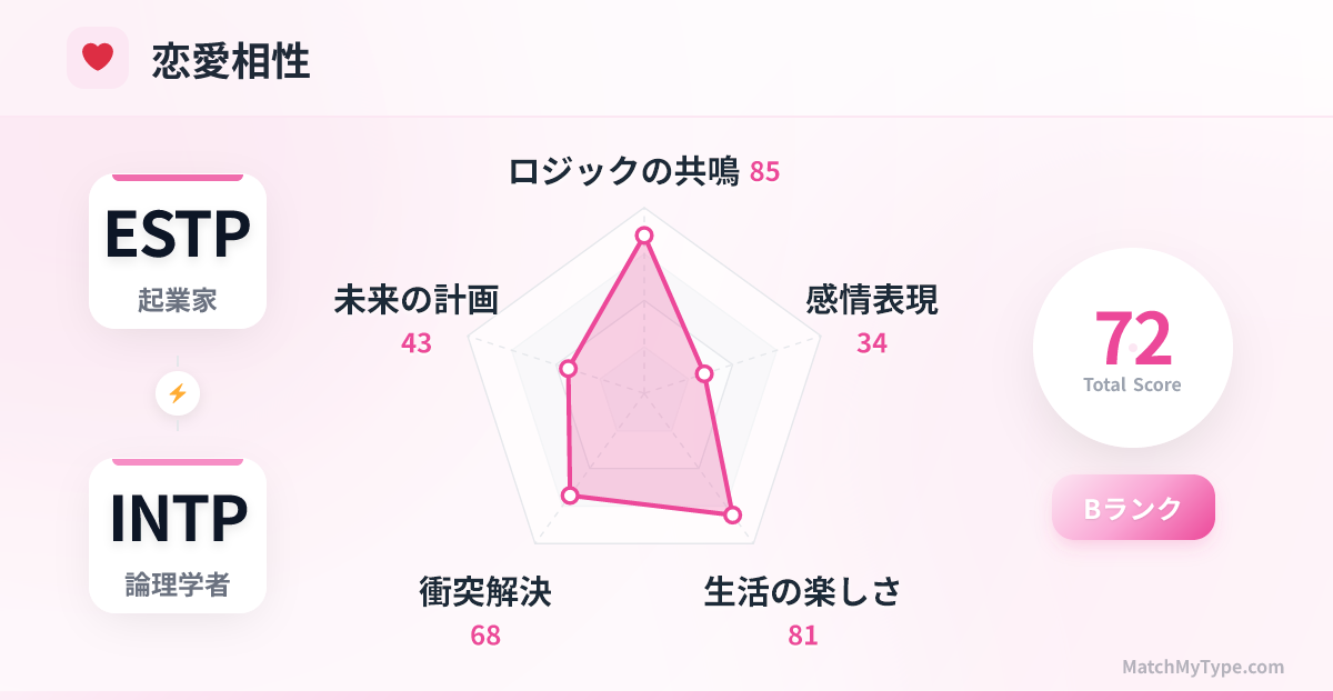 お互いを「完全」に近づけることができる組み合わせです。 **ESTPがINTPから学ぶこと**:行動する前にもう一歩踏み込んで考え、長期的なリスクを予測する方法。現象を通して本質を見抜き、システム思考を構築する方法。 **INTPがESTPから学ぶこと**:先延ばし癖を克服し、即座に行動する方法。自信を持って人と接し、社交不安を克服する方法。頭の中ではなく、今この瞬間を楽しむ方法。