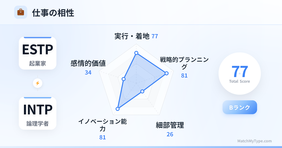 最高のブレインストーミング・パートナー。プロジェクトの初期段階では、驚くほど多くの案を出し合えます。しかし実行期には、役割を分担することをお勧めします。ESTPはクライアント対応や現場監督、INTPはバックエンドの技術サポートや資料作成。細かいデータの照合が必要な作業を二人で一緒に行うのは避けてください。