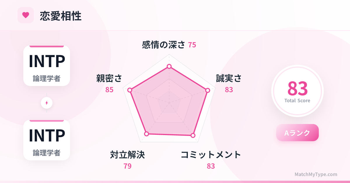 INTPとINTPの結合は、しばしば「2台のロボットの初恋」と揶揄されます。これは極めて省エネで、効率的、かつ純粋な関係です。絶え間ないお喋りで存在を確認する必要も、ドラマチックな喧嘩で愛を証明する必要もありません。二人の世界では、「愛している」よりも「理解している」ことの方が重要であり、理解こそが最高級の愛なのです。