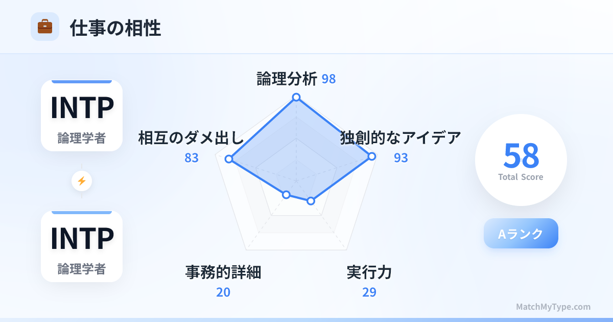 これは「天才研究所」のような組み合わせです。極めて複雑な論理パズルの解決、デバッグ、あるいは純粋な理論研究という任務において、あなたたちは無敵です。しかし、多方面との調整が必要なプロジェクト管理や退屈な事務作業となると、それは災難の始まりです。